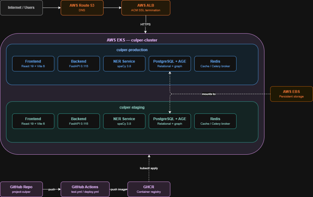 On the infrastructure side, we finalized our deployment architecture on AWS. The application will run on EKS with a single cluster (culper-cluster) serving two isolated Kubernetes namespaces: culper-production and culper-staging. External traffic enters through an Application Load Balancer with SSL termination handled by ACM, and DNS is managed through Route 53. Subdomains are locked in. The addresses projectculper.com for production and staging.projectculper.com for the integration environment.